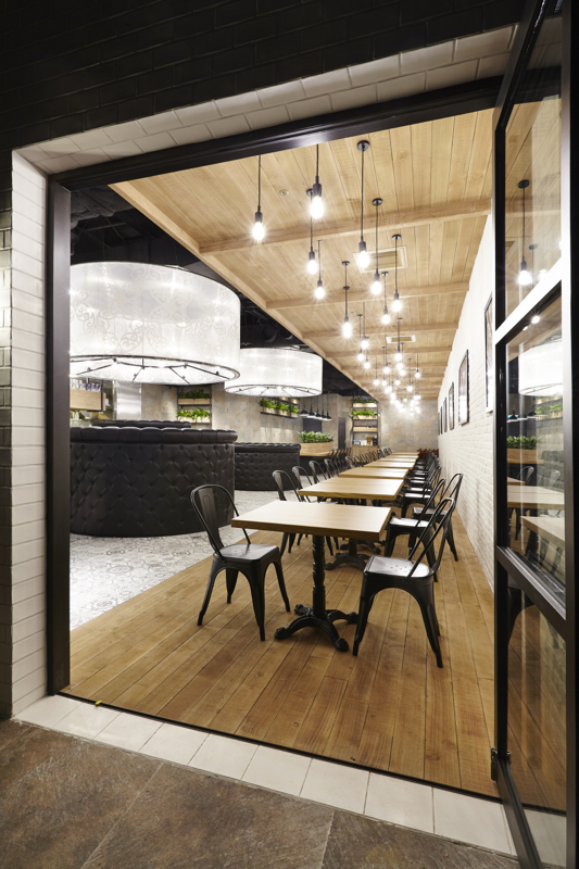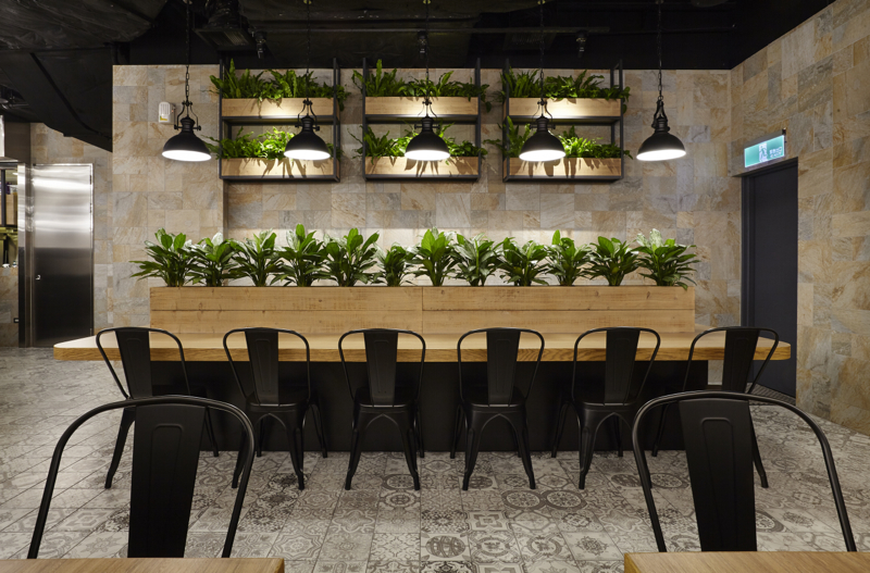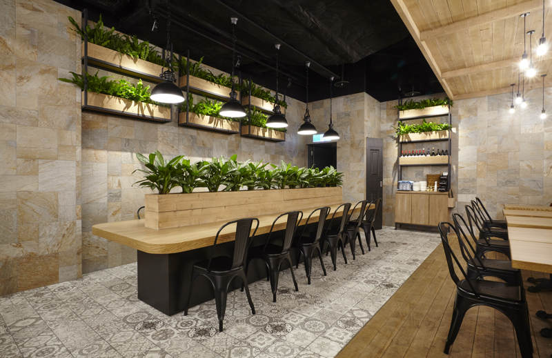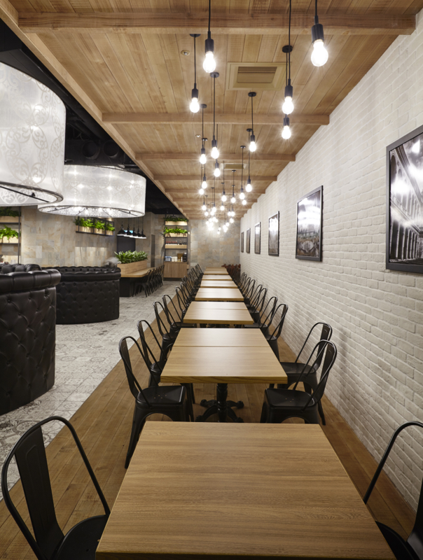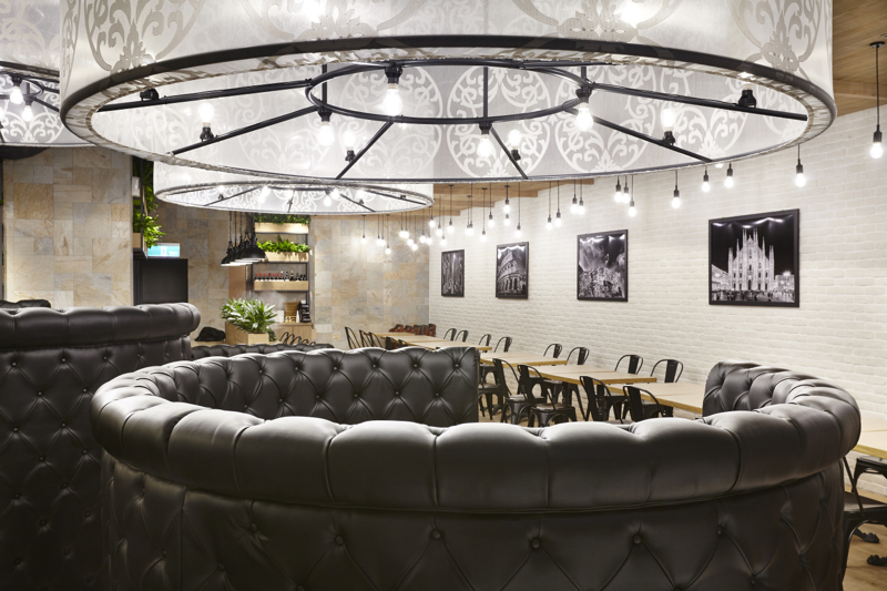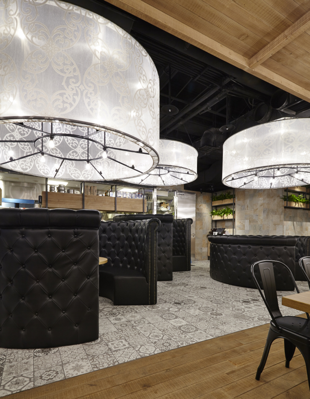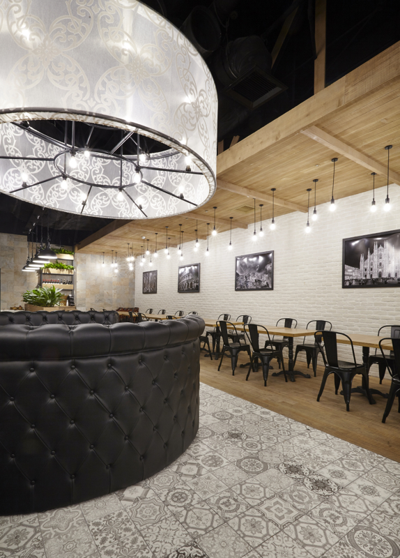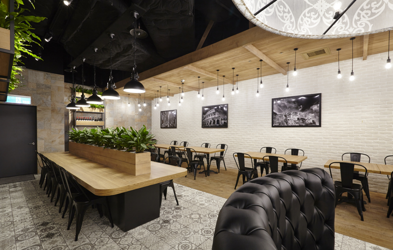 50坪の区画面積に対し、テーブル席・ソファー席・厨房と3つの空間に分け、それぞれの内装仕上を変えたり高低差を設けたりして、単一的なのっぺりとした空間構成にならないよう計画しました。テーブル席の床・天井は、オーク無垢材を使用。ソファー席の床はヨーロッパ調柄磁器質タイル貼り、天井はスケルトン躯体剥き出しのうえ黒吹付け塗装。円形ソファーはブラックレザーの布団張り、異なる径・高さで3台製作し、それに合せた同一径のペンダントライトを、日本で選定した生地を持ち込み台湾で製作いただきました。また、ヨーロッパの街並を上品に飾るような斑岩の壁には植栽を、ホワイトレンガタイルの壁には、イタリアの建造物や風景を撮影した写真を配し、全体的なバランスを考慮した装飾も施しました。ファサードはモノトーンで統一。厨房とはガラス入り建具で仕切り、ピザ釜を前面に配置、通路を往来するお客様がどこからでもピザを作る様子が伺える厨房レイアウトにしました。レジカウンター横にはテイクアウトコーナーを設け、同一フロア内にある映画館やゲームセンターに向かうお客様にも焼き立てのピザを提供出来るような計画としております。