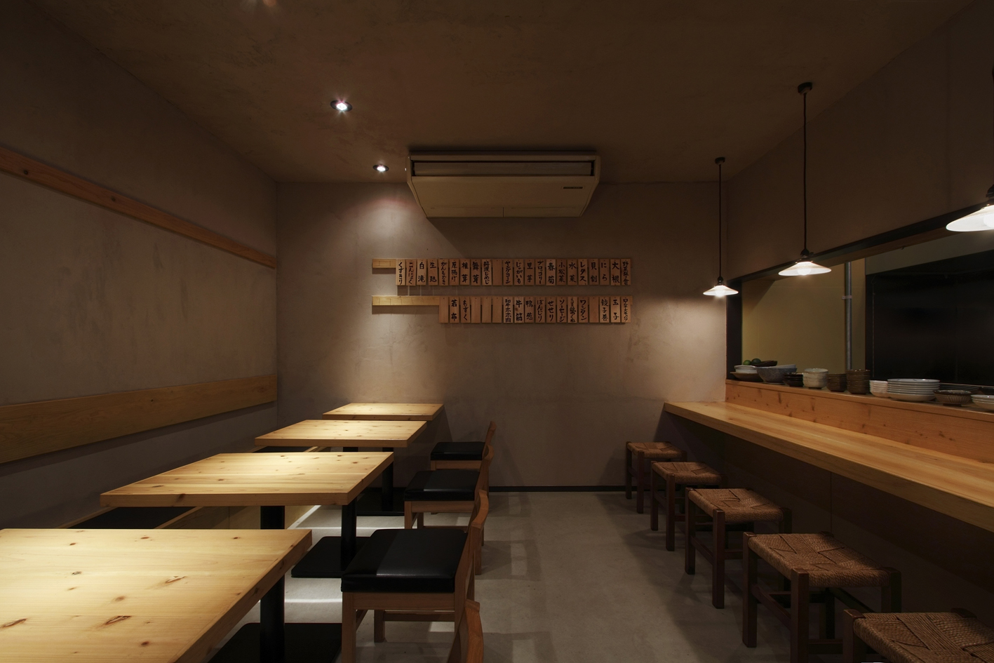 WORKS小料理 悦 2012.9 DINING女性店主がおでんのみで勝負する名店。その潔さに呼応すべく、使用した内装素材は漆喰(天井壁)と杉無垢板(カウンター・テーブル・ベンチ・メニュー)のみ。老舗の小料理店のような落ち着いた雰囲気を出すために、漆喰には茶色の色粉を混ぜて渋い色合いの天井壁に仕上げ、杉材は素地の風合いを活かすように仕上げました。福岡市中央区西中洲3-19ベイヒルコート1F photo:Kenta Kawasaki/Lefty Photo PREVNEXT