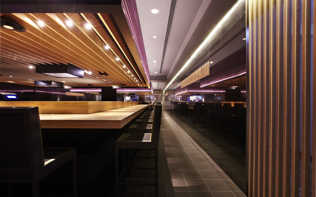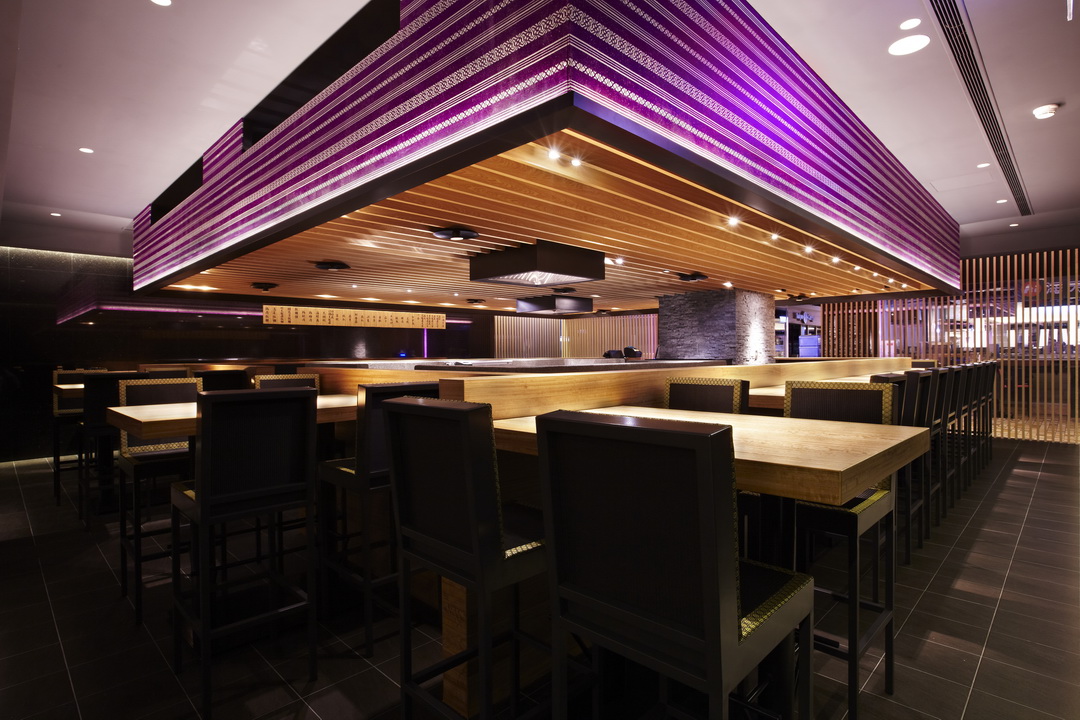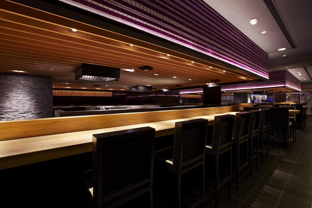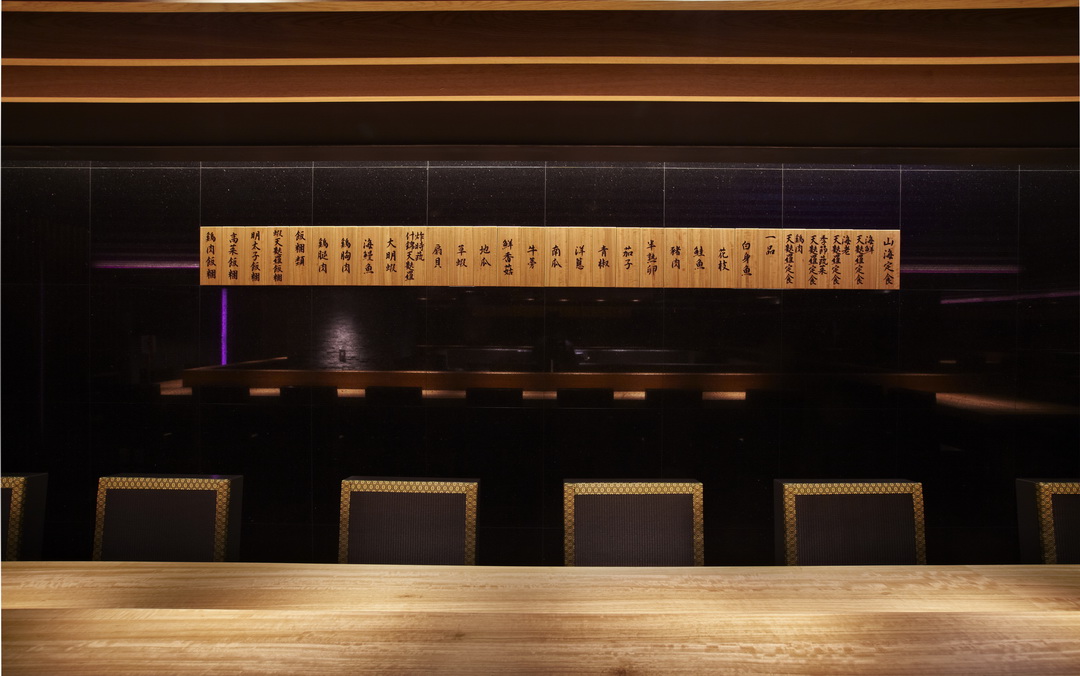博多発の天ぷら専門店。計画当初から多店舗展開を視野に入れ、その第一号店として選ばれた場所が、台北市内の中心地にある統一阪急百貨台北店でした。プランニングにあたりクライアントから要望された項目はたった一つ。「揚げたての天ぷらをダイレクトにお客様に提供したい」それならばと、揚げ場を店内中央に配置し、職人をぐるりとカウンター(客席)で囲むプランにしました。そしてそれが一つの劇場であるかのような空間に仕上るために、また、博多発としてその第一号店を台北に出店することに際して店を彩る仕上素材は福岡産のものを使いたいという想いから、カウンターの外径そのまま上部に約7m四方の天蓋(垂壁)を設け、それを特別に紫と銀の糸で「博多献上柄」に紡いだ「博多織」で覆いました。漆黒の中に浮かび上がる博多織と、その中心で食材と対峙し最高の天ぷらをお客様に献上する和食職人を演出するライティングを仕掛け、高級感と空間の広がりをもたせるために、壁面は鏡面の黒大理石を貼り、紫の博多織で囲われた空間が幾重にも反射するような演出を施しました。弊社にとって初の海外案件。この物件を機に、毎年台湾で仕事をさせていただいております。