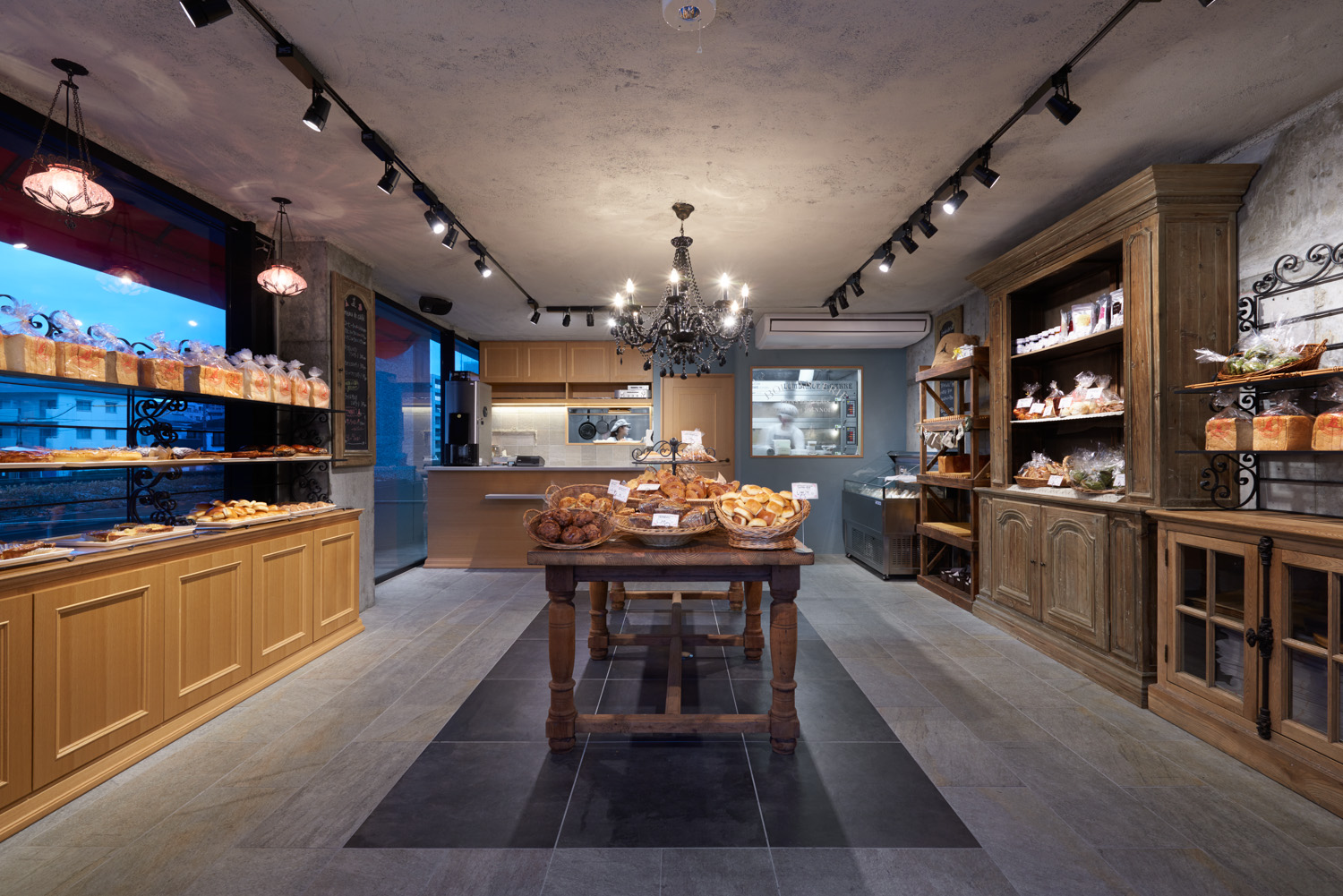 ヨーロッパ産の天然石の床にアンティークの什器を配置、有機的な模様を施した特注アイアンフレームで棚板を設け、フランスの街角にあるような雰囲気を感じるさせる空間計画としました。