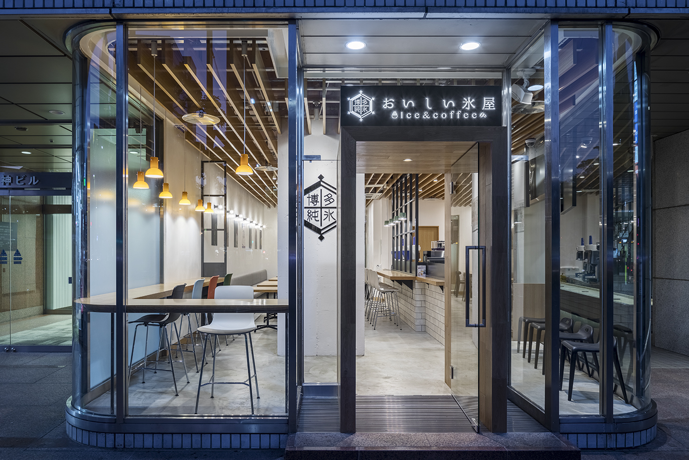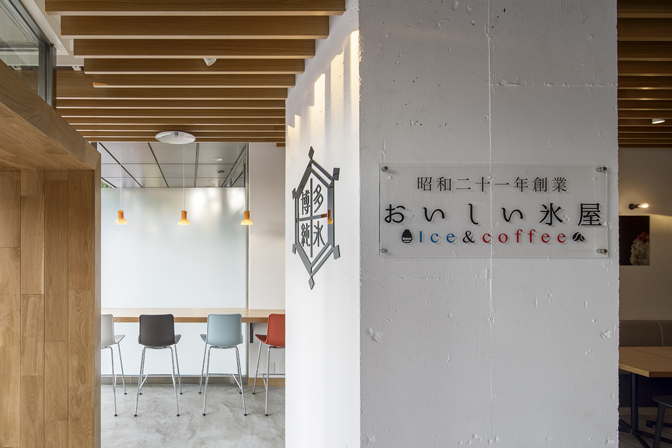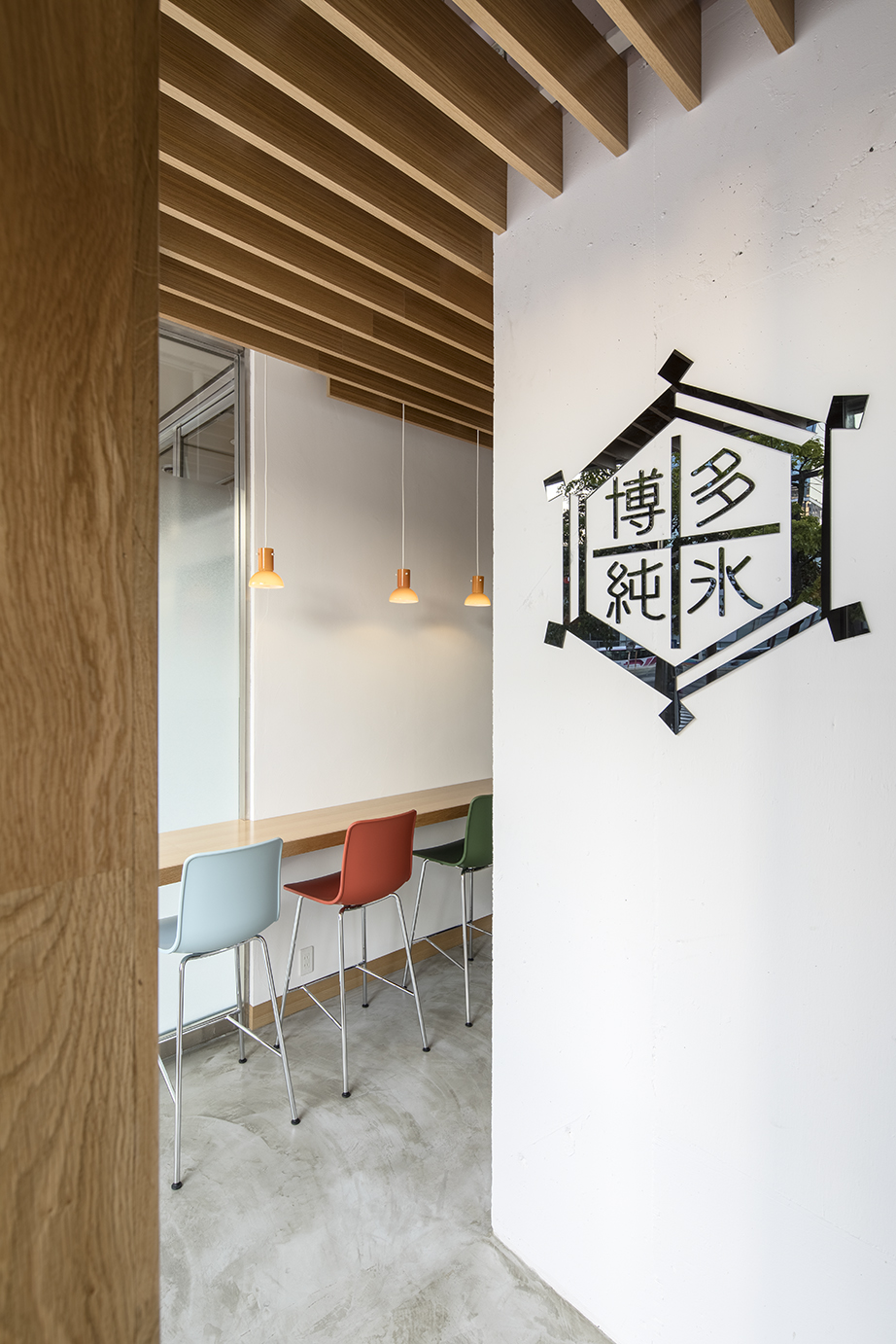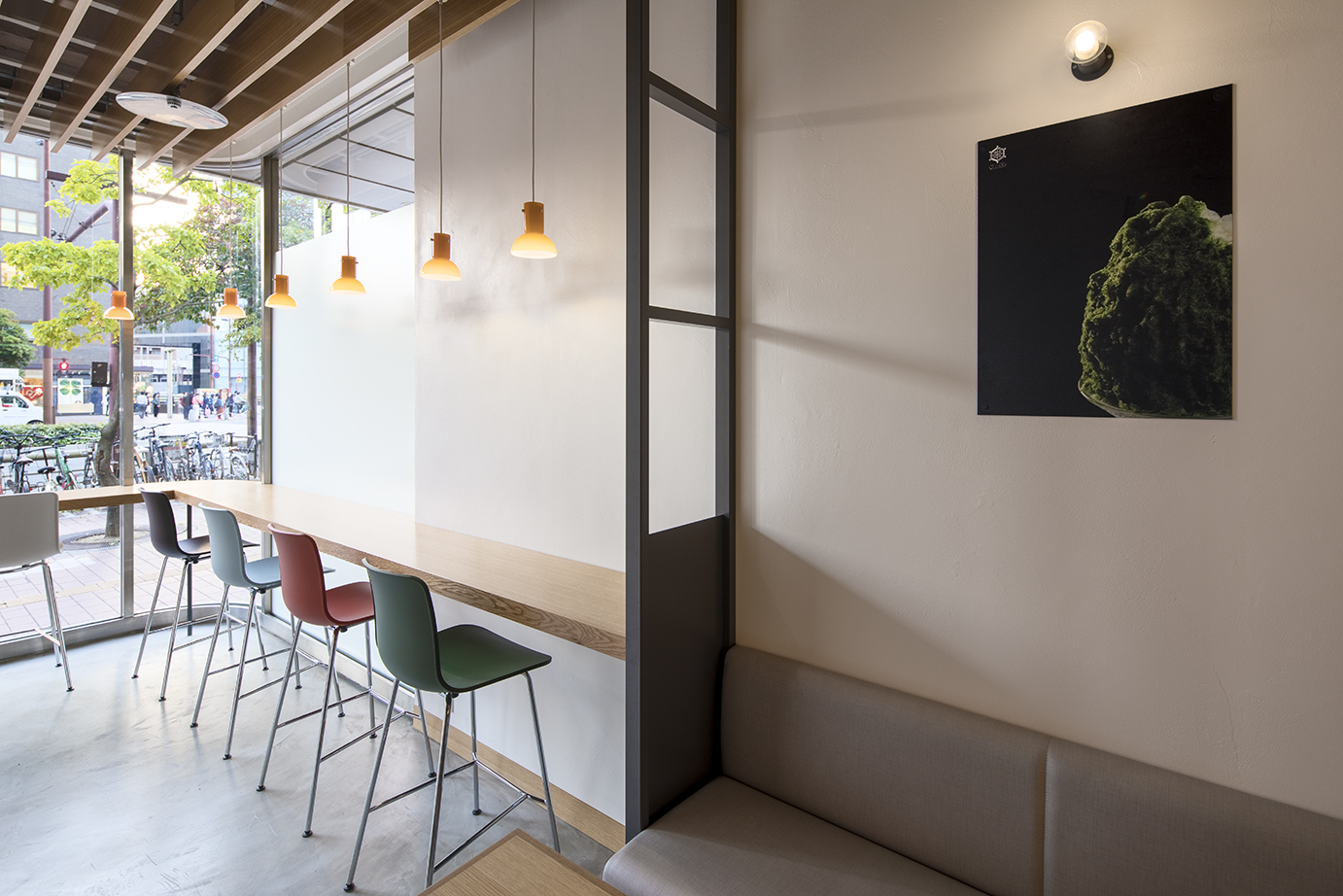 多店舗展開に向け、その旗艦店となるべくクライアント様から設計上要望されたことは「流行り廃りのないカフェスタイルのデザインを」ということでした。極力シンプルに形成しようと考え、まずはファサードを覆っていた壁を全て解体し、ビル元々のサッシとガラスをあらわにさせ、福岡のメインストリートである渡辺通りからダイレクトに店内を見通せるようにしました。内部を構成する床はモルタル金鏝仕上、壁は漆喰金鏝、天井は、スケルトンに軽鉄下地だけ残っていたものをそのまま利用して下部に木ルーバーを165㎜ピッチで取付けました。そのルーバーとルーバーの間にスポットライトを配置、器具本体が直接目に触れにくいよう計画しております。外から店内に入るエントランスには門を造作、内外部を隔てるサッシ間を貫通するように敢えて通路を設けてその境界を曖昧にし、と同時にお客様が店内に踏み入る一呼吸、そこを潜ることによるちょっとした特別な感覚を味わっていただけるよう工夫しました。前述の木ルーバーと門、さらにパントリー壁面とテーブルは全てホワイトオーク材仕様で統一、箇所により木目を変えることで違った表情を見せております。カウンター席とパントリー及びテーブル席間にはスチール格子を設け、繋がっていながらも空間が分かれるような計画としております。ペンダントライトとチェアは、当店で提供するかき氷のソース(マンゴー、抹茶、苺、リゾートブルー他)と色見を合わせ、シンプルな店内にちょっとした華やかさを演出いたしました。