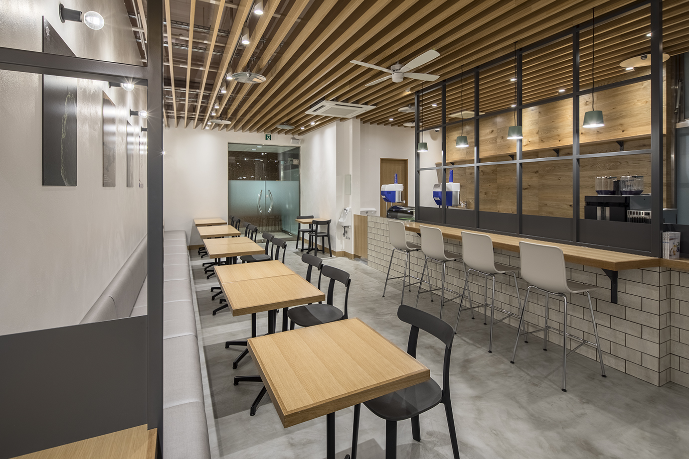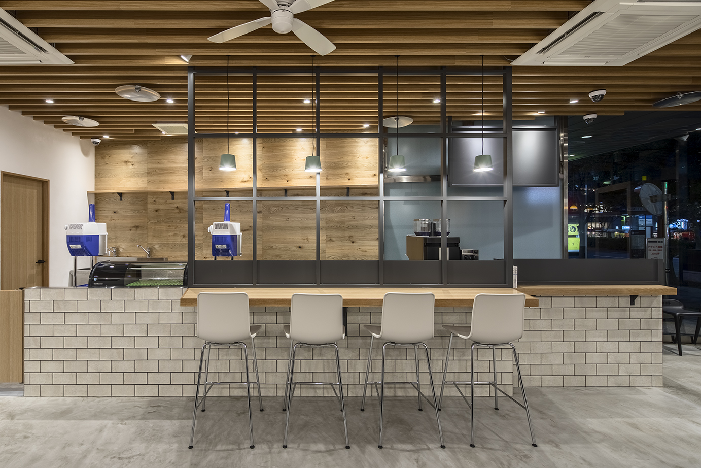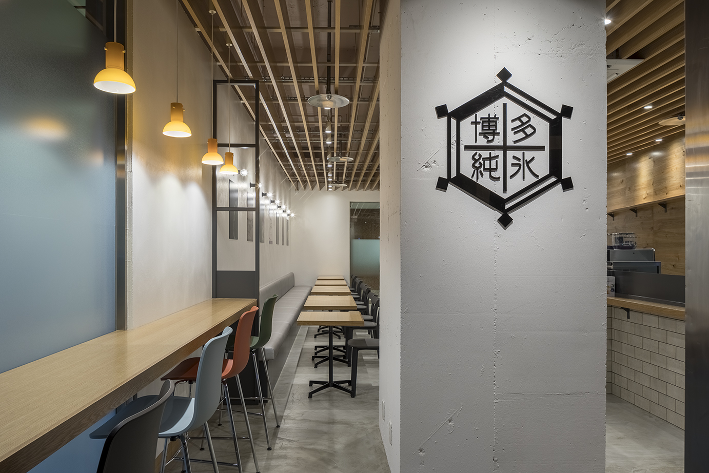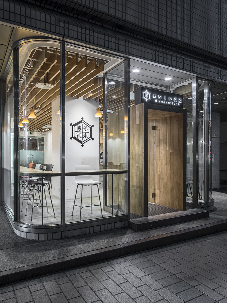多店舗展開に向け、その旗艦店となるべくクライアント様から設計上要望されたことは「流行り廃りのないカフェスタイルのデザインを」ということでした。極力シンプルに形成しようと考え、まずはファサードを覆っていた壁を全て解体し、ビル元々のサッシとガラスをあらわにさせ、福岡のメインストリートである渡辺通りからダイレクトに店内を見通せるようにしました。内部を構成する床はモルタル金鏝仕上、壁は漆喰金鏝、天井は、スケルトンに軽鉄下地だけ残っていたものをそのまま利用して下部に木ルーバーを165㎜ピッチで取付けました。そのルーバーとルーバーの間にスポットライトを配置、器具本体が直接目に触れにくいよう計画しております。外から店内に入るエントランスには門を造作、内外部を隔てるサッシ間を貫通するように敢えて通路を設けてその境界を曖昧にし、と同時にお客様が店内に踏み入る一呼吸、そこを潜ることによるちょっとした特別な感覚を味わっていただけるよう工夫しました。前述の木ルーバーと門、さらにパントリー壁面とテーブルは全てホワイトオーク材仕様で統一、箇所により木目を変えることで違った表情を見せております。カウンター席とパントリー及びテーブル席間にはスチール格子を設け、繋がっていながらも空間が分かれるような計画としております。ペンダントライトとチェアは、当店で提供するかき氷のソース(マンゴー、抹茶、苺、リゾートブルー他)と色見を合わせ、シンプルな店内にちょっとした華やかさを演出いたしました。