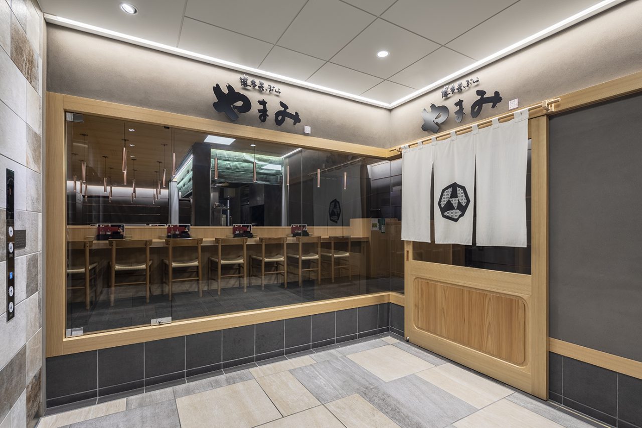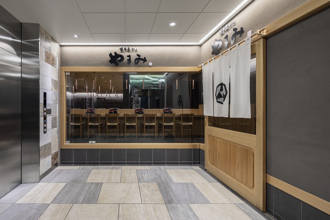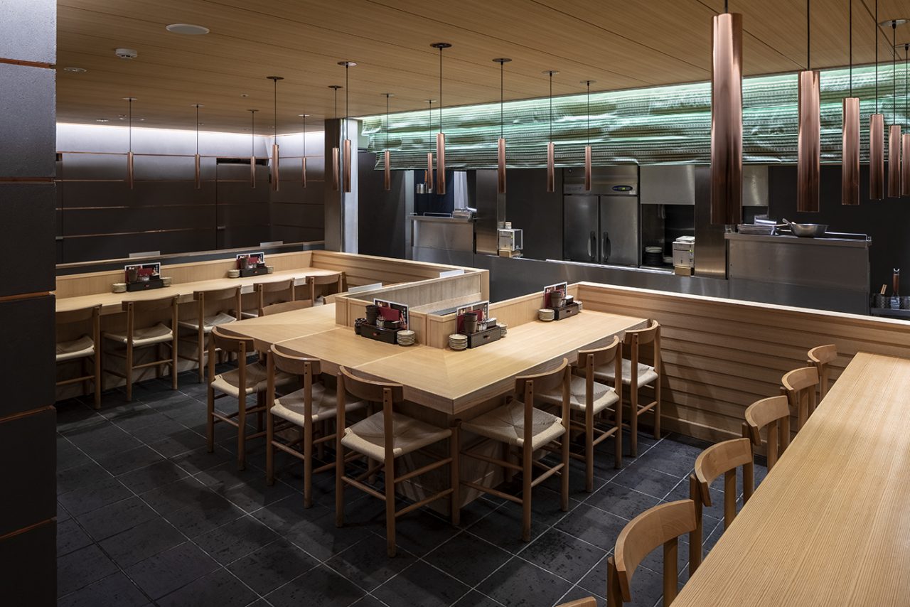 「揚げたての天ぷらをダイレクトにお客様に提供する」というコンセプトのもと、カウンター越しに店員が全ての席へ直接支給できるスタイルをとる。他店舗においては、揚げ場を中心に回遊するようにカウンター席を設けていましたが、今物件においては、施設側の建築条件上、厨房区画が定められた位置に限定され、また、消防の条例や席数の確保を考慮して、厨房区画から店員の通路動線を三本用意し、それに沿って蛇行するようにカウンターを設ける計画としました。今回、厨房区画と客席を隔てる境界として博多織を使用。異なる三つの緑色で染色された糸で紡いだ博多織を、三重グラデーション上に垂らしております。外廻壁面は薩摩黒土を使用したワラスサ入り撫で切り左官仕上げとし、高さ方向に等分、コの字に曲げた銅板を壁とフラットに四方水平目地として挿入、壁に落ち着きと共に艶やかな表情を持たせました。ペンダントライトも同じ銅色で統一、カウンターの杉の色味と墨色の壁床、各々の素材感を引き立て合いながらバランスの取れた上品な空間になったと思います。