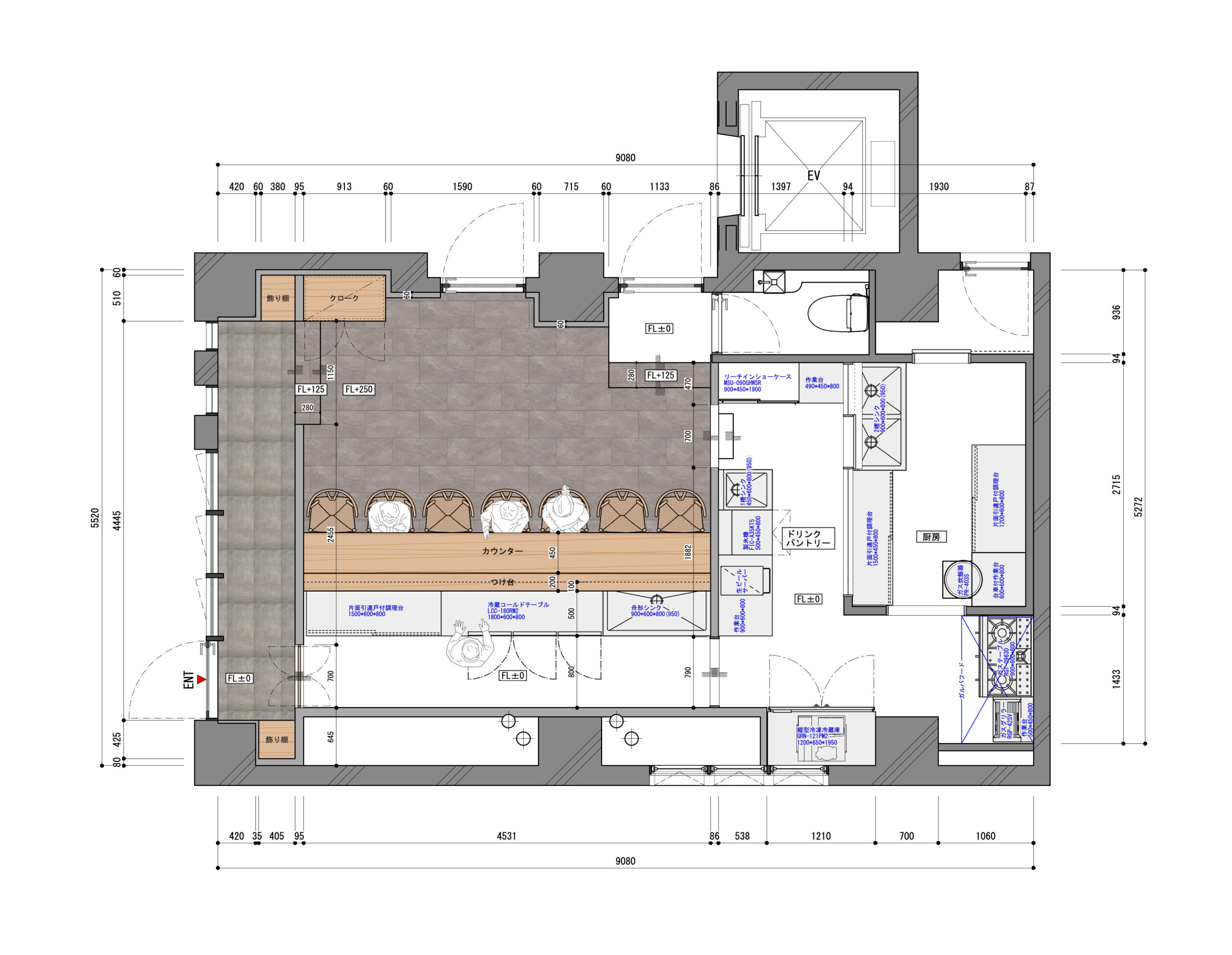 ファサードがビルのガラスサッシにて前面道路に面している為、内側に間仕切を設けて通路を取り、二重エントランスの様にすることによって外部からの視線を遮ると共に、客席までの導線を長く取ることによって、お客様に店内に入る期待感を持っていただく様な計画としました。