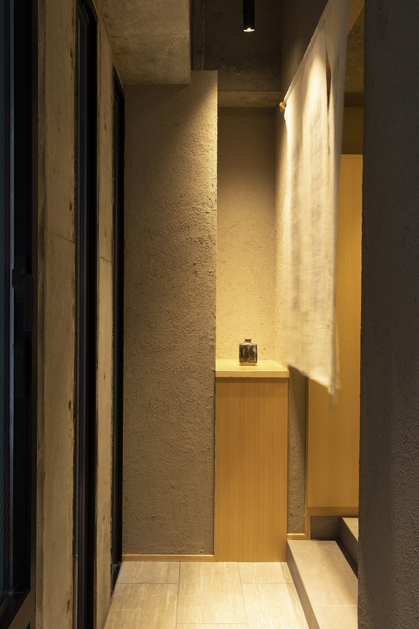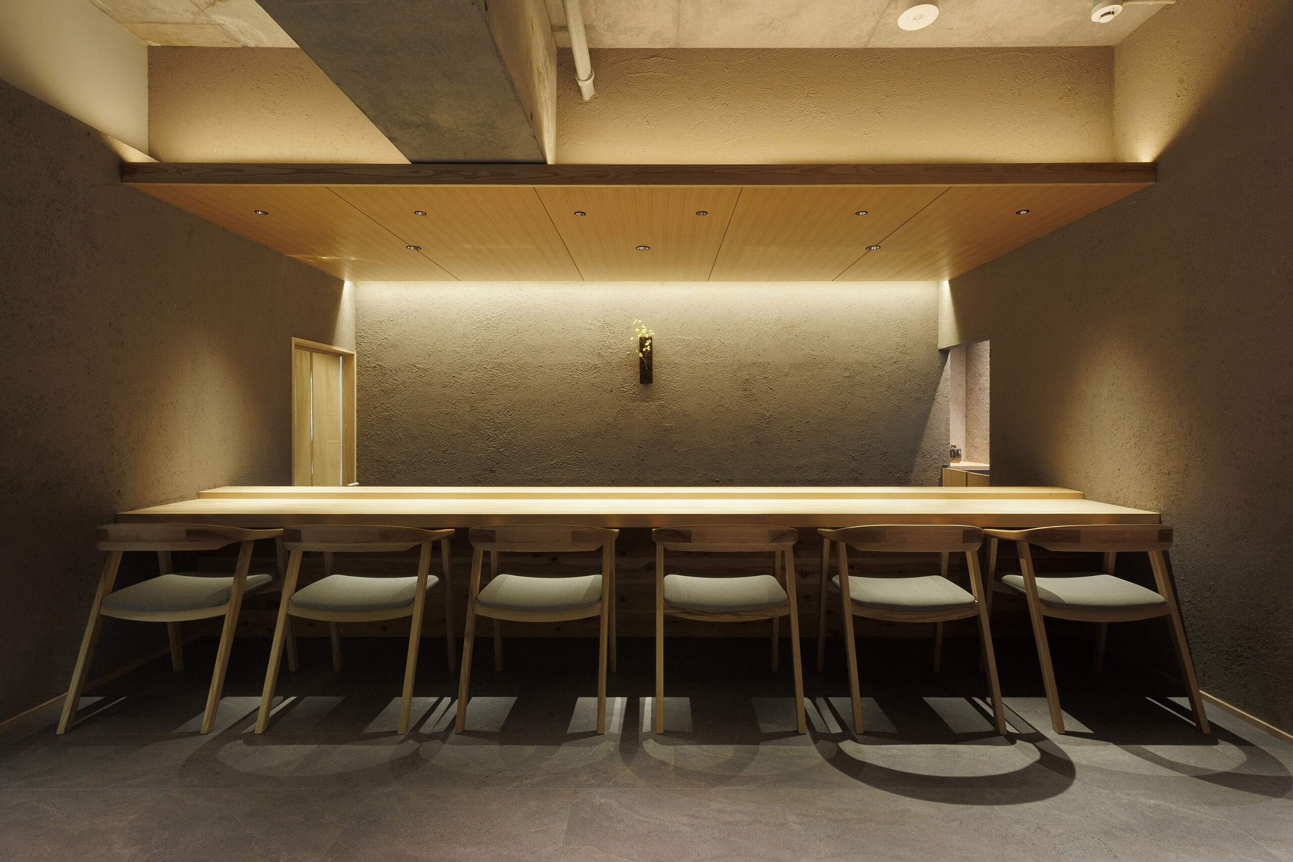 天井は敢えてスケルトンのコンクリートスラブ現しとし、それに合わせて全体的なバランスを考慮して、壁は淡い灰色味がかった尾張木節粘土金鏝仕上、床はコンクリート調タイル貼としました。但し、壁仕上はワラスサ撫切り仕上げとすることによってその素材感を出し、更に間接照明により陰影を際立たせて落ち着いた雰囲気を持たせました。
