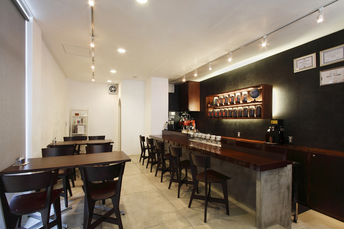 氏が開業を目指し修行した東京の老舗店「カフェ・バッハ」の流れを汲み、クラシカルな雰囲気にモダンさを取り入れた空間計画としました。確かな理論と技術をもって焙煎された珈琲豆、それにより抽出し洗練された一杯のコーヒーを求めるお客様のために、その一杯を心から満足していただけるよう、そんな想いを込めて設計させていただきました。