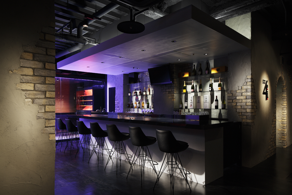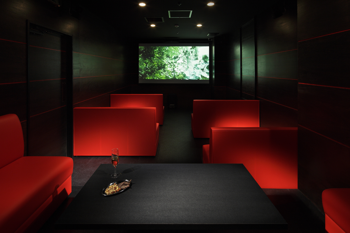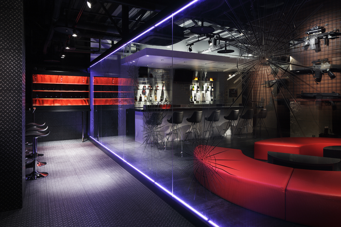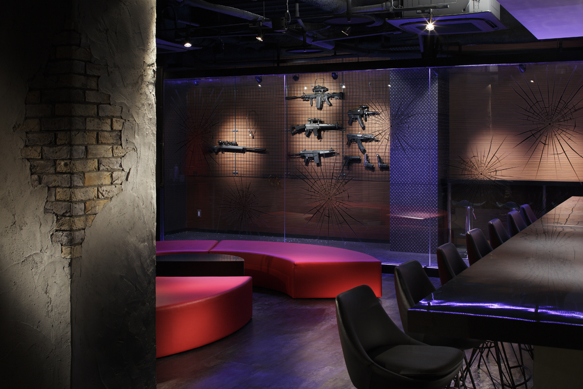 シューティングルーム・シアタールーム・カラオケルーム・ホール(TVゲームやダーツが出来る)という4つの空間を併せ持つアミューズメントバー。ビルの4階にあることも踏まえ、ロゴデザインも含め弊社で命名させていただきました。古いファクトリー感を演出するため、天井はスケルトンで敢えてデッキや配管等を剥き出しにし、間仕切り壁や柱型にはレンガタイルを貼った後、それを補修したかのように所々モルタル金コテでエイジング加工を施しました。シューティングルームとホールを仕切るガラスパーテーションにはカッティングシートで弾痕を作り、紫色の間接照明で浮かび上がらせ、建具やソファーは赤色で統一、九州随一の繁華街である中洲に立地する「大人の遊び場」としての妖婉さを醸し出す空間計画としました。